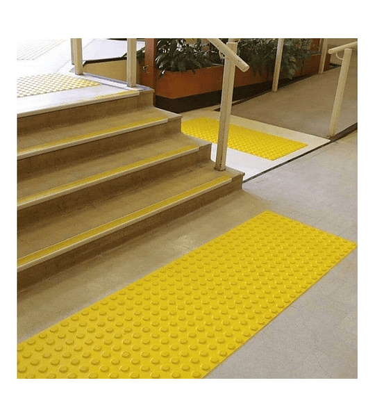 El color amarillo intenso garantiza visibilidad diurna y nocturna, mientras que el diseño antideslizante y resistente al clima permite su instalación en exteriores como andenes, veredas, escaleras, paraderos, rampas, cruces peatonales y accesos a espacios públicos o privados.